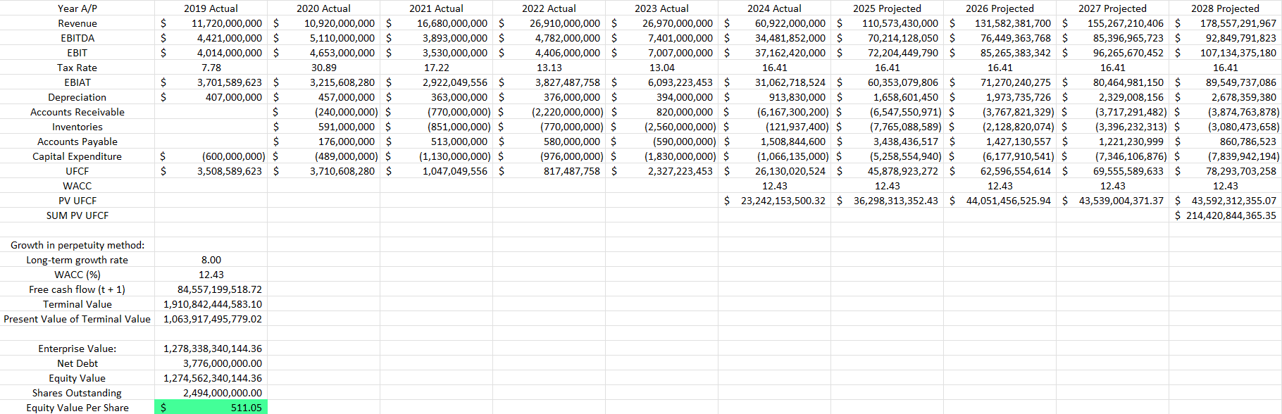 As you can see by the equity value in green, the current Equity Value Per Share is $511.05, given the specific inputs to the model and a 4-year price target of $816.57. You can change these inputs to generate any number you want, so it's important to be realistic and as unbiased as possible to avoid terrible outputs. One thing I want to highlight is that this assumed some pretty unlikely things, and it still produced a result much lower than the current share price.