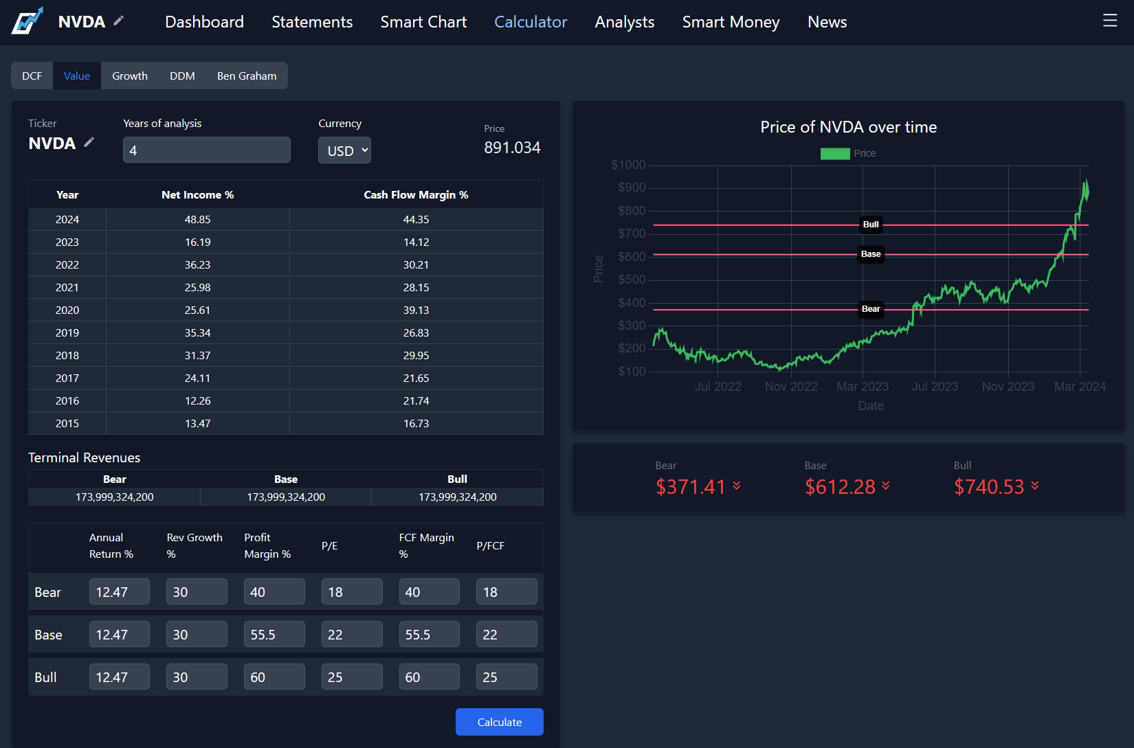 Since the "Years of Analysis" was set to 4, the top image shows 4-year price targets, and the bottom image shows the prices I would have to buy NVDA at to get a 12.47% (the cost of equity) return every year for the next 4 years, assuming the model's inputs are correct.