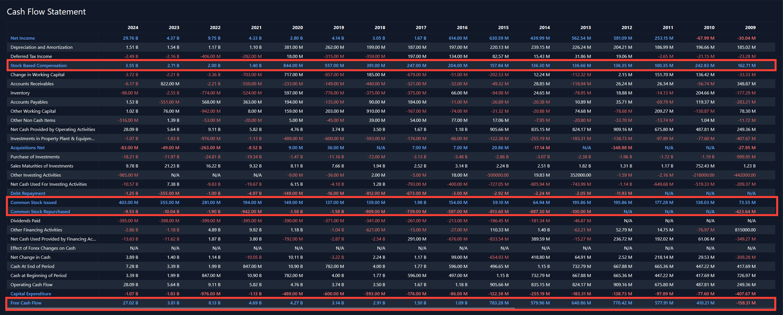 One caveat is that the stock-based compensation should be subtracted from the free cash flow number. If NVDA was to sell the shares on the open market and then give that money as compensation it would be a cash expense so it shouldn't be treated any differently without doing the middle step in my opinion. Nevertheless, the share count is decreasing, but I think that $10 billion could be used more effectively somewhere besides buying back very expensive shares, so I am not a huge fan of that decision currently.