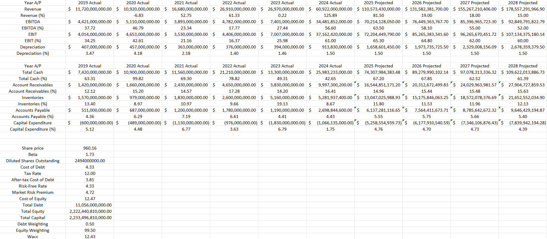 For me, the question is not if NVDA will keep growing with the AI boom, its whether or not their margins will fall back down in the coming years due to competition, which is a possibility the market does not seem to be pricing in, but we will run scenarios on that shortly. First, I am going to run a full Discounted Cash Flow Model and show all of the inputs and outputs below. I will keep the margins at their fully elevated levels.